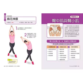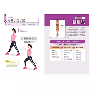 其次是強化與走路最有關的肌肉群,以補強現代人久坐、久站的腰腹臀腿無力現象,黃如玉醫師特別親自設計與示範腰方肌、臀大肌、腓腸肌等十組共三十式關鍵肌群速感鍛練操。在書中除了仔細介紹這些關鍵肌群在行走時所扮演的重要機能,更貼心提供當該肌群緊繃無力時,造成的步態與體態改變,因而引發的疼痛發炎症狀,以及你不知道的身體代償表現等重要醫學知識,只要循著這些健康提醒,就能找出自己最需要鍛鍊的肌肉群。以腰方肌緊繃無力來說,步態體態改變包括:骨盆前傾、翹著屁股走路、小腹凸出等→疼痛發炎症狀:椎間盤突出、腰椎退化、臀部疼痛等→常見代償表現:西洋梨型身材、上背痛、肩頸痠痛等。所以,只要把這些動作成為日常保養操,擊退痠痛、正脊又美肌。