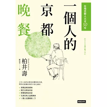 3.在一餐中品味京都的春夏秋冬、人情歷史:在柏井壽的引領下,與自己共進晚餐,無須壓抑,不用妥協,聆聽身體的渴望,想吃什麼就出發,按照自己的步調,品嚐京都五味——既嚐酸、甜、苦、辣、鹹,亦品美食的滋味、人情的韻味、傳統的風味、職人的脾味、景致的況味。京都的一人晚餐,就如春天的飛櫻、夏天的川涼、秋天的楓紅、冬天的初雪,一點一滴沁人心脾,令人回味無窮,身心皆受用。