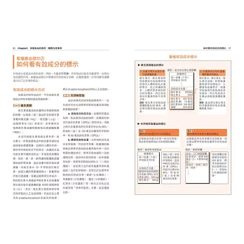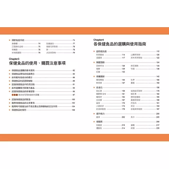 第三篇從產品標示、認證與檢驗標章、添加物、何謂單方複方、製造方式、服用注意事項、副作用、與藥物交互作用、保存,循序漸進、簡明扼要地建立正確的保健觀念;