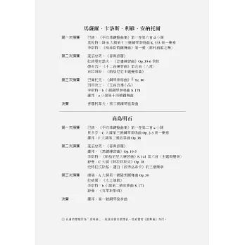 以鋼琴大賽為舞台的溫暖成長小說。眾人認定的明日之星、打橫殺出的無名天才、小時了了但遇上人生困境的少女、年歲已長但仍想一圓夢想的已婚男子,以及在往事中心潮起伏的知名音樂家們,競賽不只試煉極限,也讓他們再次確認自己與音樂的永恆牽絆。恩田陸敘事清新流暢,仍舊充滿魅力。──楊佳嫻(作家)