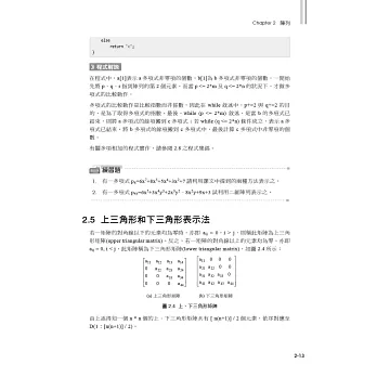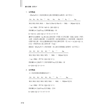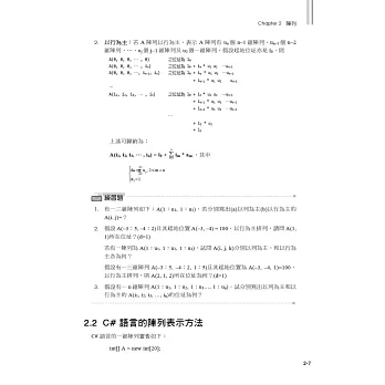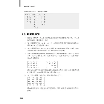 每一章的每一小節幾乎都附有“練習題”,讓使用者能藉由測驗,評量自己對此節的了解程度;而書末亦附有這些練習題的參考解答可供對答使用。章末再附上“動動腦時間”,這些題目取自歷屆的高考或研究所考試題目,抑或是筆者自行設計的題目,每道題目後面皆標示出自節數,若有不詳之處,即可對照作答。對於課文中的重要主題,也附有完整的C#程式,可供讀者加以練習。