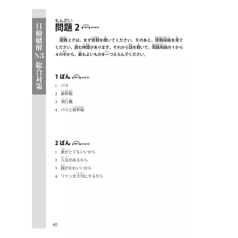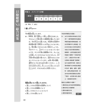 《日檢聽解總合對策》一書,不只提供日檢聽力的解題技巧,並詳細介紹整理了容易使考生混淆的文末表現(例如雖然是否定形式但其實是肯定語氣),與口語中常見的縮約形和慣用表現等。不僅推薦給因為日檢聽力而感到不安的人,對於感到自己學了很多文法、背了很多單字,卻還是因為聽力而感到挫折的學習者而言,也是非常實用的一本聽力攻略與練習書。
