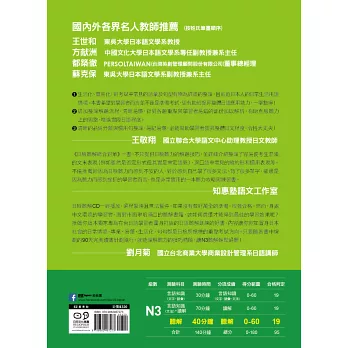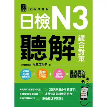 日檢聽解CD一經播放,過程緊湊且無法暫停,如果沒有做好萬全的準備,很難合格。然而,身處中文環境的學習者,面對市面琳琅滿目的聽解書籍,該如何選擇才能得到最佳的學習效果呢?推薦你這本獨家專為在台日語學習者量身打造的日語聽解訓練的好書,內容讓你宛如置身日本社會的日常情境,專業、易懂、生活化,句句都是日檢所標榜的重點考試方向。只要隨著書中規劃的90天完美讀書計劃進行,就能理解聽力的技巧精隨,讓N3聽解輕鬆過關!