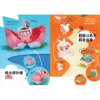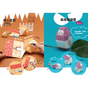本書收入10組作品,它們可以藉由碰觸而瞬間彈開或是裂開而出現叫人驚喜的摺紙作品,或是按壓後自動起立、拉出機關同時被不知名的怪物咬住手、按一下就會自動翻身等。會飛!會跳!會咬人!充滿童話趣味。製作過程從型紙、切割順序、折疊順序都詳細解說,並附製作說明影片,讓你進入看似複雜而且需要耐心的紙機關世界,沉浸在療癒的製作過程中,不手殘即可完成可愛紙機關。