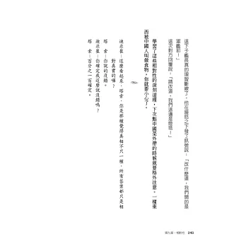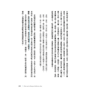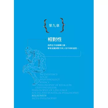 在解釋不同哲學科目的過程中,作者總是以畫龍點睛的方式,在一開始提到一段對話。對話的內容很平淡,幾乎有點無厘頭,但的確是我們日常生活中有可能發生的談話方式。這種表達的方式,讓所有人會感覺到,其實哲學就是生活中的一部分。對於這一點,我對本書作者產生肅然起敬的感覺,因為哲學要講得深入淺出,其目的就是重現日常生活中的智慧。