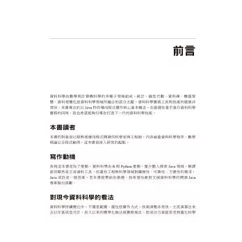 資料科學因R與Python而蓬勃發展,但Java為今日的資料科學應用帶來堅實、方便與擴展性。Java軟體工程師可透過本書循序學習資料科學技能。作者Michael Brzustowicz在本書中闡述資料科學每個處理程序背後的數學理論以及如何以Java實作這些概念。