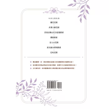 本書特為花友及療癒師量身打造,全書介紹350種世界花精及38組花精分類選花,完整收錄蘭花花精、非洲大樹花精、喜馬拉雅山花精、蘑菇精素、富士山花精、雷光風水環境精素及巴哈花精等7種花精品牌!