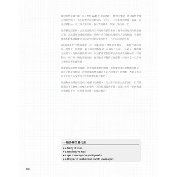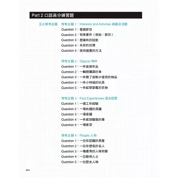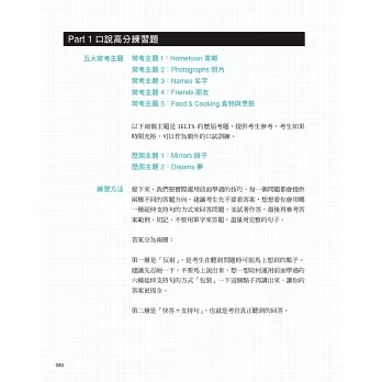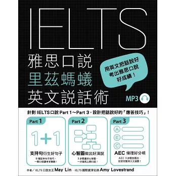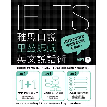 May老師還針對三大題各別提出「應試小提醒」,幫考生抓緊各大題的練習重點及得分技巧。書末另附八回雅思口說模擬試題,加進新鮮活潑的問題。最後的附錄,則詳細整理出考生在「準備期」與「考試當天」應注意的事項,考生一定要善用。