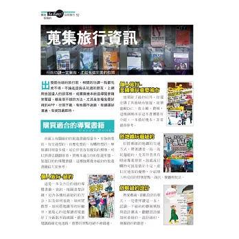 旅行一開始的準備規畫、辦護照、辦簽證、購買機票、安排行程、機場入出境手續、行李打包、如何搭乘各種大眾交通工具、打國際電話、如何選擇入宿,全都預先設想周到,並給予適當的指示和解答。絕對是害怕自助旅遊者的救星,自助旅遊愛好者的好幫手。