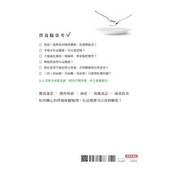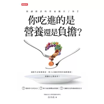本書與姐妹作《別讓錯誤的營養觀害了你》,兩書宗旨都是藉由精確的科學驗證,釐清市面上似是而非的觀念,匡正一般大眾對營養學的迷思。前作從五大營養素著手,奠定大眾對營養觀的基礎;本作則深入日常餐桌,以三餐飲食、慢性疾病、減重方法、保健食品等,與一般大眾切身相關的議題切入。作者白小良博士有紮實的學術背景,再配合臨床營養師的經驗,她所帶給大家的,是一本有憑有據又實用的營養教戰手冊。推薦給所有關心自身與家人健康的讀者。──吳成文 中央研究院院士、國家衛生研究院創院院長、陽明大學特聘講座