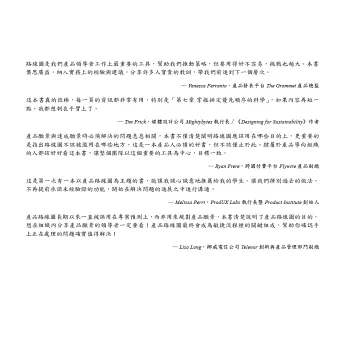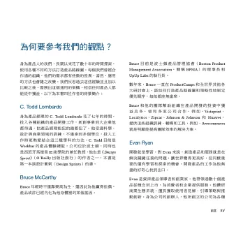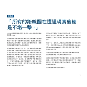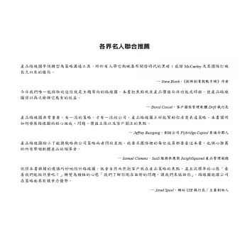 「產品路線圖早該轉型為策略溝通工具,終於有人帶它衝破瀑布式(waterfall)開發時代以來的黑暗!感謝McCarthy及其團隊打破長久以來的僵局。」──Steve Blank,《創新創業教戰手冊》(The Startup Owner’s Manual)作者