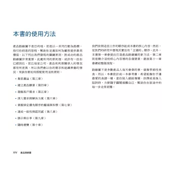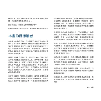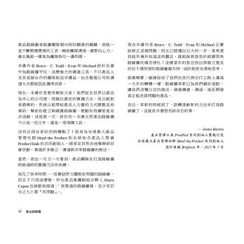 不論你是產品經理、產品負責人、分析師、項目經理、專案經理、Scrum大師、首席開發人員、設計師、開發經理、企業家還是公司負責人,本書都希望各位能從中體會:
