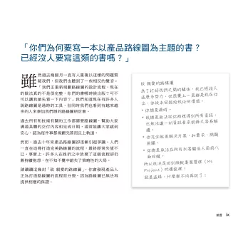 「產品路線圖非常重要。有一流的策略,才有一流的公司,產品路線圖正好能幫助你清楚表達策略。本書闡明如何發展路線圖的核心組成、問題、價值主張以及客戶關注的焦點。」 ──Jeffrey Bussgang,創投公司Flybridge Capital普通合夥人