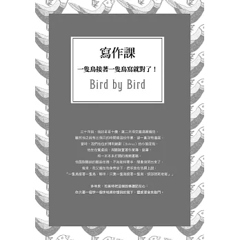 「三十年前,我的哥哥十歲,第二天得交一篇鳥類報告。雖然他之前有三個月的時間寫這份作業,卻一直沒有進展。當時他坐在餐桌前,周圍散置著作業簿、鉛筆和一本本未打開的鳥類書籍。面對眼前的艱鉅任務,他不知如何著手,簡直快哭出來了。後來身為作家的父親在他身旁坐下,把手放在他肩上說,『一隻鳥接著一隻鳥,夥伴。只要一隻鳥接著一隻鳥,按部就班地寫。』」