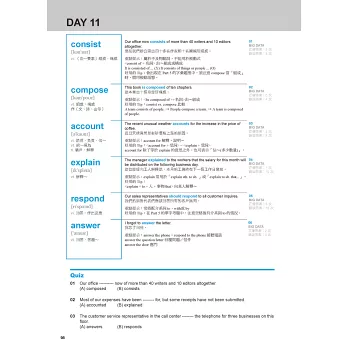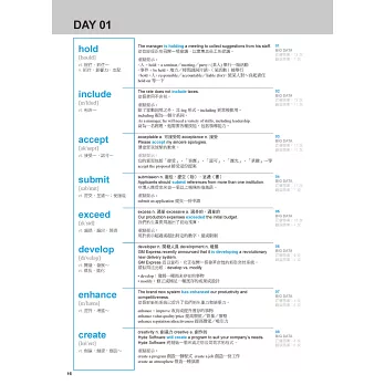市面上許多單字書都告訴你「不用背」、「躺著背」、「輕鬆記憶」、「神奇記憶」…等,這麼容易的話,就沒有人為了學習英文或英文考試而苦惱了吧!事實上,不管是為了何種目的而學英文,最怕的就是往錯誤的方向走去!本書羅列多益各類型考題中,必然出現的單字,不管是在題目中、正確選項或錯誤選項中,然後教你這個單字「都是怎麼用的」、「考試怎麼考的」。而且考題中最常出現「長得很像」或「近似意義」的單字,讓你來選擇(比如說上面的例題)。因此,本書單字解說的設計,就是要讓你一次記下並釐清一個關鍵單字的衍生用法,有效率地提升單字理解力、運用力以及句構分析力,絕對不同於坊間「字義 + 單字變化 + 例句」的制式單字書。