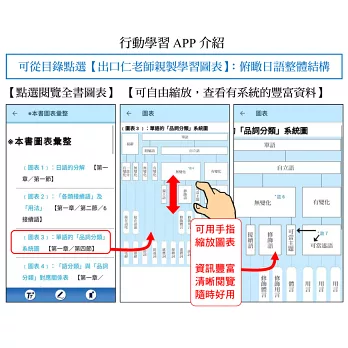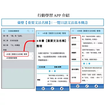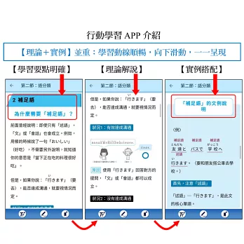 (1)將書籍內容,融合文字、圖像等元素,規劃流暢的學習動線,整合設計為『標準日本語行動學習教室』。讓消費者享受科技帶來的學習便利、流暢、與舒適。以一支APP呈現: