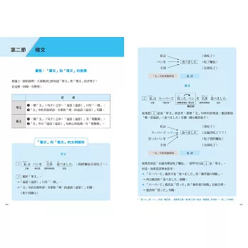 提升日語能力,從「單純的句子」到「複雜的句子」,務必徹底理解的重要內容。到日檢N4程度為止,大多是比較單純的句子;N3程度以上,就會開始出現許多構造複雜的句子。「閱讀」或「書寫」複雜的句子時,如果缺乏文法知識,就不容易掌握文句。即使「乍看之下找不到規則」的複雜句子,也必定「具有規則性的結構」。本章以簡單明瞭的方式,循序漸進介紹「單純的句子」到「複雜的句子」。