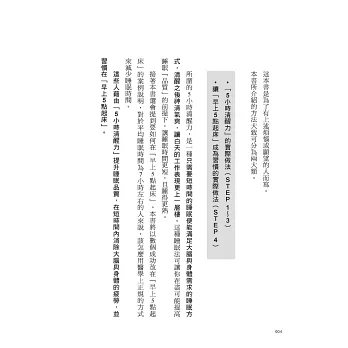 首先會介紹「提高睡眠品質」的方法,那就是「5小時清醒力」,讓你在短時間的睡眠中,也能享有良好睡眠品質(而且從剛起床到一整個白天都能神清氣爽,精力充沛)。