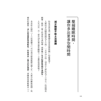 且本書所介紹的「減少睡眠時間」的方式,都符合醫學、生理學,不會造成負面健康隱患。