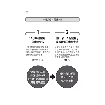 只要確實實踐這四個步驟,你就能在兩個月內成為每天只要睡5個小時便足夠的短眠者。就算晚上12點才睡,隔天早上5點就能元氣滿滿地起床,開始認真工作、讀書。
