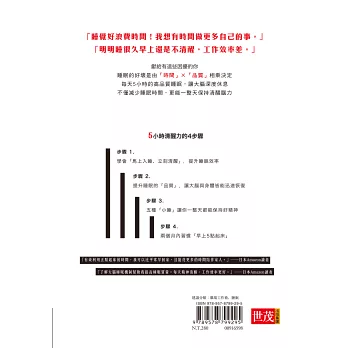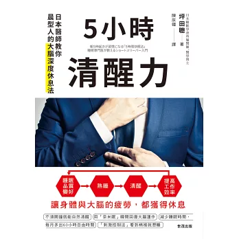 不過不用擔心。若能學會本書所介紹的「5小時清醒力」,即使縮短睡眠時間,早上也不會感覺疲倦而爬不起來,白天更不會因為想睡而降低生產力。