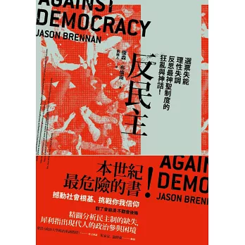 我們相信,人人有同等的政治參與權,有權利參與選舉、投下神聖的一票。掌握參與政治的權利則讓每個人擁有權力,決定什麼法案是我們所需,什麼人物非我們所用,而這一再抉擇的過程,會讓公民更成熟、社會更建全,但本書《反民主:選票失能、理性失調,反思最神聖制度的狂亂與神話!》作者傑森‧布倫南卻說,我們都錯了!