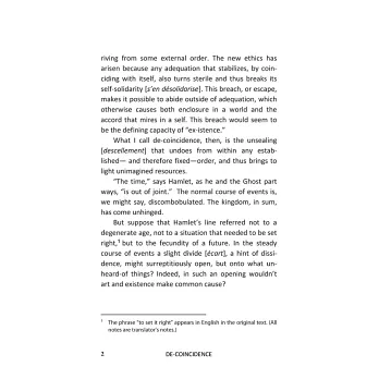 Artists ever since have been methodically applying themselves to the enterprise of de-coincidence. They have striven to undo the capacity for coincidence that lies at the core of art’s previous apparatus—and specifically of representation (the observance of shapes and proportions as well as the demands of perspective, the reproduction of colors, and anything that produces resemblance), which they denounce as an illusion. The purpose of the enterprise, however, is not merely to establish a rupture with the past, to break free from constraints and norms, to mark out deviance or assert dissent—i.e., to denounce an adequation that smacks of conformity. As a concept de-coincidence goes back further, to the origin of the écart that made modernity and elucidates it in its principle. This while demonstrating that "coinciding" (entering into complete adequation), although it satisfy and perhaps even amount to an exploit, is not viable and, at bottom, lacks exigency: it is at once fake and sterile. Thus de-coinciding