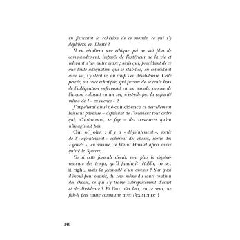 De-coincidence undoes the enterprise of coincidence on which classical art rests (did perhaps the great painters of the past not have a secret sense of such a de-coincidence and its exigencies?), but a parallel de-coincidence just as thoroughly undoes the ontological enterprise that establishes truth as adequation (between "thing" and "mind"). Or, indeed, undoes the moral of wisdom: living "in conformity with nature." Modernity founds itself on this new suspicion that there is no "nature" or Being to serve as possible substructure and foundational order anymore. To de-coincide, however, is to open an écart with respect to a congruity that brooks no further latitude or initiative; it is to extricate oneself from an order that, in its fulfillment, inhibits its possibles and sterilizes. Coincidence is death. To coincide is to bog down, whereas to de-coincide is to promouvoir (elevate and valorize) and dégager (extricate, extend, and develop).