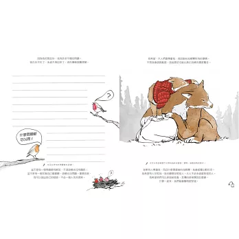 ※書中藉由有趣且新穎的實作帶領我們解讀自己的情緒、回憶摯愛,跟著小熊的步伐,我們也能慢慢走出悲傷,把回憶化為動力,堅強且堅定的持續向前走。
