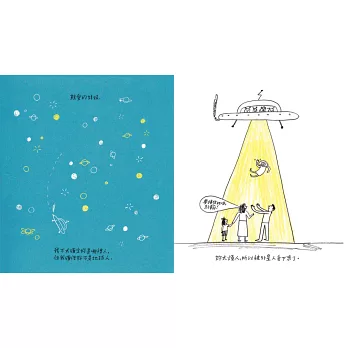 書中的文字不多,但是描述姊妹之間的小爭吵或是肢體衝突,甚或報復行為的橋段都非常逗趣。例如,故事第一句就是,「我不太確定你是哪裡人,但我確信你不是地球人」,接著,媽媽大叫要爸爸接住從天上掉下來的妹妹,「這個傢伙因為太煩人了,被外星人丟下來了。」可不是嘛!這個被外星人嫌棄的小生物竟然誕生在這個家,而且每個人都如此包容他,連貓咪身上被貼滿貼紙也不敢吭氣。姊姊不知道發誓幾次,再也不理妹妹了,但是每次都馬上忘記,妹妹這傢伙就是有這種本事!而看完這本書之後,妳一定還會想一看再看,因為,這本書就是有這種魔力。
