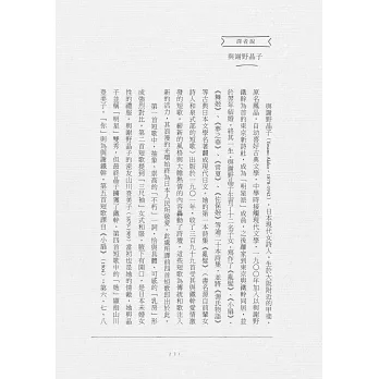 與謝野晶子為日本現代女詩人,其詩作風格大膽熱情轟動詩壇,期作短歌為傳統和歌注入新的活力,浪漫光環始終為日本人民所敬愛。