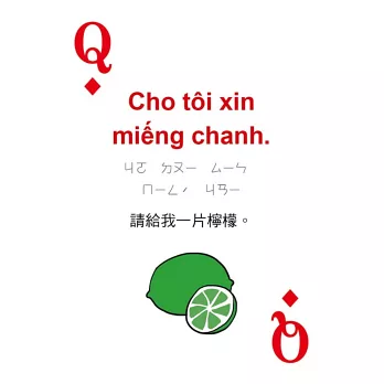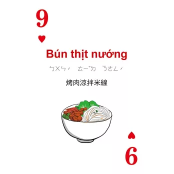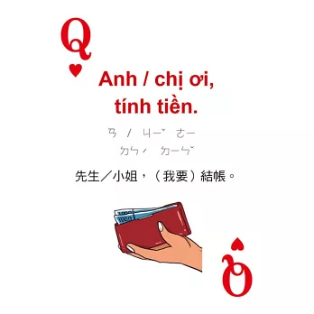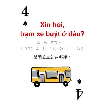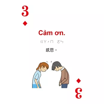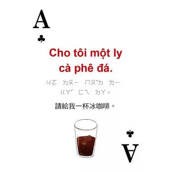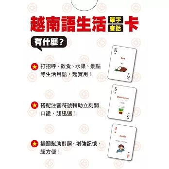 打開撲克牌玩一玩!每張撲克牌都有越南語、中文解釋,加上注音符號輔助發音,讀一讀,越南語一點都不難!