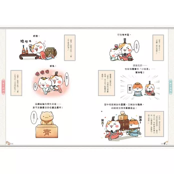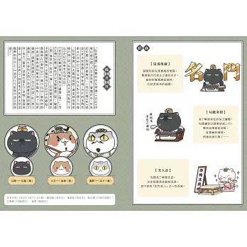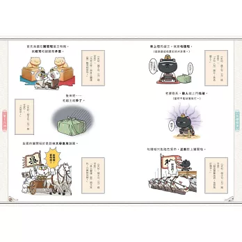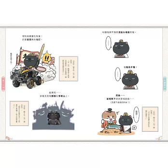每回故事皆為使用簡短文字搭配活潑的小插圖,為歷史增加趣味性,在插圖旁邊用史記裡相對應的文言文作補充,歷史描述完後還有貓咪主角群們的日常生活四格漫畫、貓咪擬人化圖片和個人介紹,十分詼諧、逗趣,內容十分豐富。但是,這一系列的圖文小說,內容排版太過壅擠,且歷史角色在每一篇故事裡所代表的貓咪角色各不相同,另人眼花撩亂,搞不清楚貓咪代表人物為誰,進而無法認真看完故事。