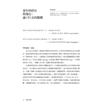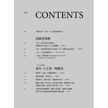 童年,人生第一場戰役。人生的戰場是從童年開始的,這些經驗使一個孩子蛻變成大人,也是永恆的生命變化之謎。二○○六年出版第一本短篇小說集《哀豔是童年》就受到矚目的小說家胡淑雯,不僅以書寫垂釣人性深不可測的差異,後續的長篇小說《太陽的血是黑的》與主編的關於白色恐怖時代的《無法送達的遺書》更可見她在性別、階級與各種壓迫的犀利角度,專訪中她曾說文學對她的影響,就是不再能同意任何標籤,書寫讓她「張開心裡頭的眼睛」。本期特別邀請日本學者橋本恭子評論《太陽的血是黑的》,與美國文學研究者胡培菱以《哀豔是童年》為核心,探究胡淑雯的童年書寫。專題則藉由《羅莉塔》、《最藍的眼睛》、《麥田捕手》、《柳橙不是唯一的水果》、《房思琪的初戀樂園》等書,探究文學中各種成長與抵抗的主題。延伸童年的題目,本期也邀請作家林蔚昀、陳思宏撰文,做為一個與眾不同的孩子,他們在哪些書的陪伴中理解了自我與世界。