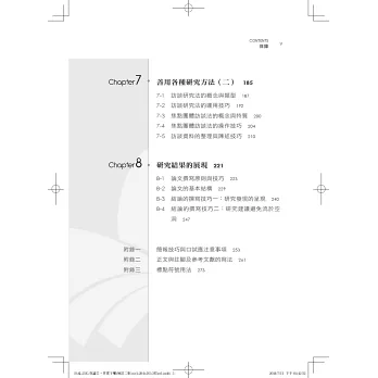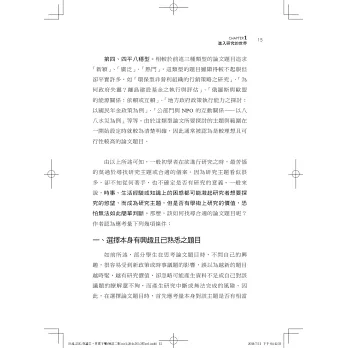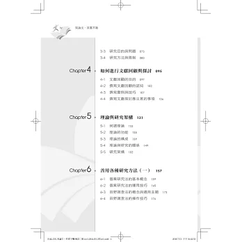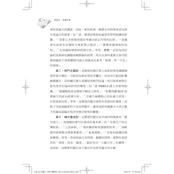 時間過得真快,距離上次本書的初版已經過了五年。這段期間社會環境不斷改變,碩博班的市場快速萎縮,但不變的是學生對於寫論文的抱怨和恐懼,且論文品質每況愈下。儘管我在上課努力藉由實例告訴學生寫作技巧,甚至要學生練習,但我發現,或許受到網際網路的影響,學生的文字能力、閱讀能力和理解能力正在急速下降中。過多抽象或理論性的文字,對多數的學生而言是吃力的、不著邊際的。也因此,惟有透過更具體的實例,明白告訴學生何者為佳?何者為劣?才能避免不斷發生重蹈覆轍的情形。也因此,在這次再版的修正過程中,作者嘗試將上述的感觸融入到書中,盡量將論文章節可以拆解之處予以步驟化、操作化,希望透過更多技巧和範例說明,協助讀者盡快掌握和提升寫作能力,進而完成一本有水準、無愧於己的論文。