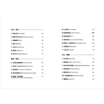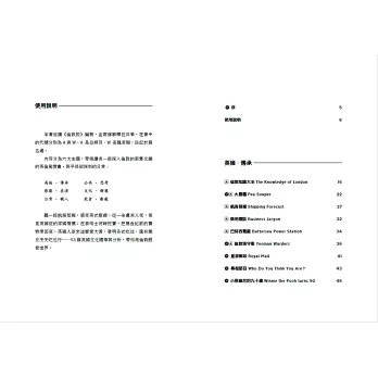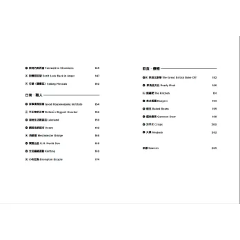 內容分為六大主題,「英倫・傳承」、「公共・思考」、「影劇・表演」、「文化・解藥」、「日常・職人」、「飲食・療癒」。帶領讀者一起深入新舊交織的英倫風情畫,與平淡卻深刻的日常。