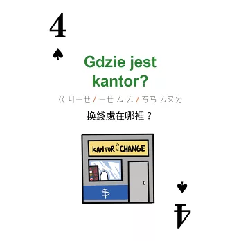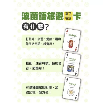 打開撲克牌玩一玩!每張撲克牌都有波蘭語、中文解釋,加上注音符號輔助發音,讀一讀,波蘭語一點都不難!