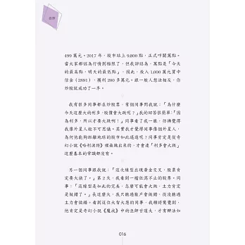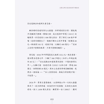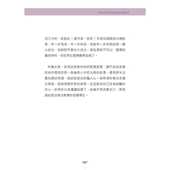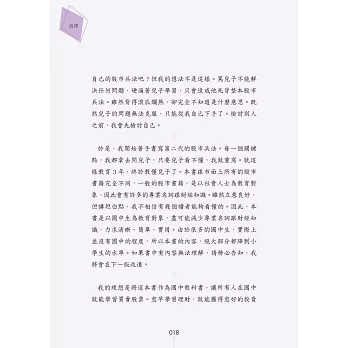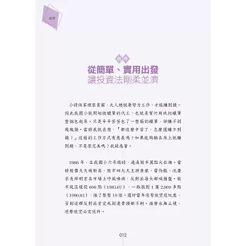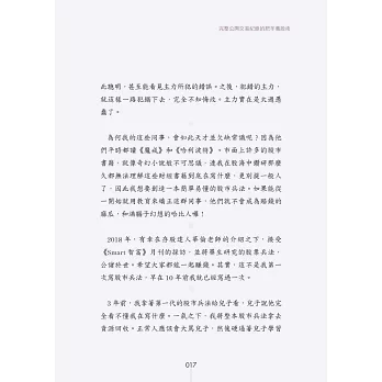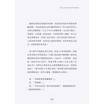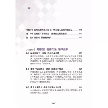 於是,我開始著手書寫第二代的股市兵法。每一個關鍵點,我都拿去問兒子,只要兒子看不懂,我就是重寫。就這樣教育3年,終於教懂兒子了。本書跟市面上所有的股票書籍,完全不同。一般的股市書籍,是以社會人士為教育對象,因此會有許多的專業名詞跟財經知識。雖然立意良好,但講難聽點,我不相信有幾個讀者能夠看懂的。本書是以國中生為教育對象,因此盡可能減少專業名詞跟財經知識,力求清晰、簡單、實用。由於很多的國中生,實際上,並沒有國中的程度,所以本書的內容,絕大部分都壓到小學生的水準。如果書中有內容無法理解,請務必告知,我將會在下一版改進。我的理想是將這本書做為國中教科書,讓所有人在國中就能學習買賣股票。「愈早學習理財,就能獲得愈好的投資效益。」
