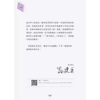 在此,要感謝我的兒子,他讓我理解自己設計的第一代股市兵法,有多麼的難以令人理解;感謝我的大徒弟,你讓我知道一般人是如何看待股票的,沒有你,我不可能知道正常人的想法。雖然我常罵你不成材,但為師是很疼愛你的;感謝我的老婆,沒有你在股市崩盤那2年每天的謾罵,我無法鍛鍊出如此堅定的心靈。最後,感謝購買這本書的你,我向你保證,你不會後悔的。如果還有任何疑問,歡迎加入臉書社團──「股市肥羊」,我將盡可能為你解答。