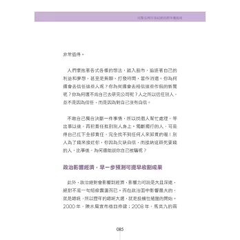 2007年,我大舉買進華航(2610),賭馬英九當選總統後,台海兩岸會三通(通郵、通商、通航)。結果2008年馬英九真的當選,華航股價開始上漲,但之後拉回。我看情勢不對,全數賣出,獲利30幾萬元。之後華航大幅虧損,一堆看好三通的人,全數賠錢,大罵為何都三通了,買華航還會慘賠?「總統大選預測精準,財富自然隨之而來。」2008年,我大舉買進華碩(2357)。遇到馬英九當選總統及金融海嘯,股市大崩盤,算了,我認了。但還遇上2009年華碩減資分割,這讓我非常生氣。「高科技反覆無常,你永遠無法知道明天會怎樣。」