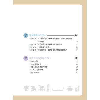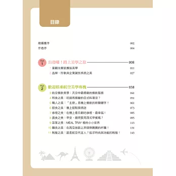 本書透過美學、觀光凝視、符號學與體驗等視角,以一趟旅程遇到的階段與元素為基礎,傳遞觀光餐旅美學之內涵。本書分成四大階段,用美學的角度來開啟一段「美學之旅」。從行前準備開始,介紹各國的觀光形象經營、餐旅品牌理念,接著到機上美學的部分,詳細分析機上精緻餐飲的博大精深以及空服員的制服之美。接著引領讀者體會與旅程息息相關的食衣住行所帶來的美學體驗,最後則讓讀者藉由作者的親身經歷,遊歷各國的自然、文化與節慶之美。