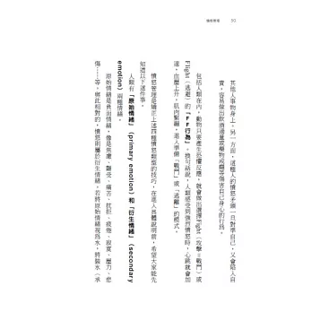 一、原始情緒:觀察二到七個月的嬰孩時,可以辨識出幾種沒有經過學習而對情境直接反應的自然情緒,如:生氣、害怕、哀傷、喜悅、厭惡、驚奇等,這是每個人從小到大都會有的,是展現與保護自我的鈴鐺(例如:在自己想做的事情被阻礙、不受到尊重、被羞辱、被委屈時,可能在第一瞬間會感覺到憤怒)。
