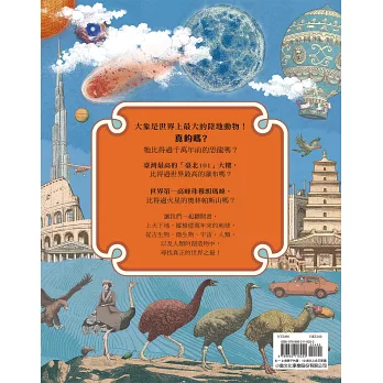 儘管大象是最大的陸地動物,但是比起千萬年來所有曾行走在地球上的生物,牠還保得住世界第一的寶座嗎?世界最高的建築「阿里發塔」聳入雲霄,但和世界最高的瀑布相比,會有什麼結果?