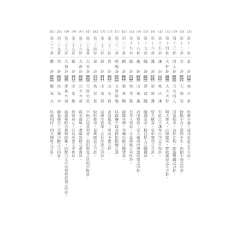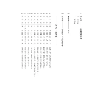 書中將六十四卦的卦象及義理融合現代思維,運用平易近人的文字、簡明扼要的系統,透過卦象的基本性質、涵意、卦義精髓及重點提示,對每卦之吉凶和特性加以說明。藉此消除文化代溝於無形,本書將是廣大讀者跨越學習《周易》門檻的最佳捷徑。