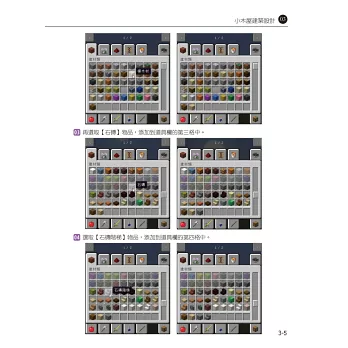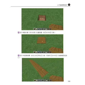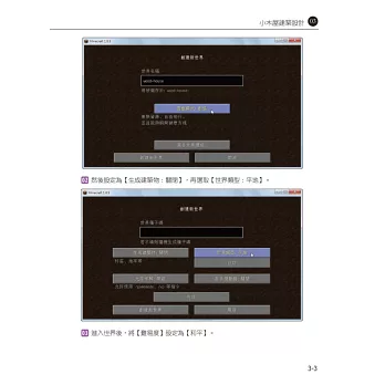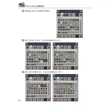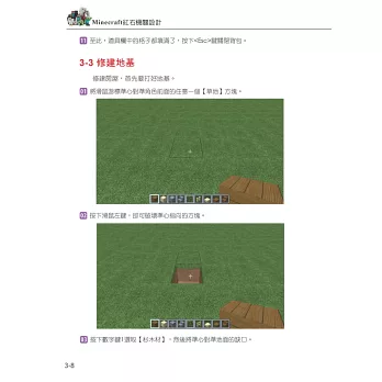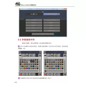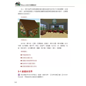 本書共分為十四章,其中包括 Minecraft的註冊與安裝、遊戲基本操作與建模技巧、小木屋建築設計、基礎紅石知識介紹、建構邏輯閘電路、強充能與弱充能、訊號的垂直傳遞、雙向開活塞自動門、中繼器及比較器原理、組合密碼暗門設計、物品的垂直傳輸、電梯結構設計、紅石大砲設計、紅石陷阱設計等章節詳細講解。透過範例引導式教學,將概念性的東西變得輕鬆易學。課程安排由淺入深,語言平實易懂,範例美觀與實務結合,逐步進入紅石機關設計殿堂。讓各位讀者在每完成一個階段的學習之後,都可以看見自己的範例練習成果,不斷提升設計掌握能力,成為優秀的Minecraft遊戲玩家。