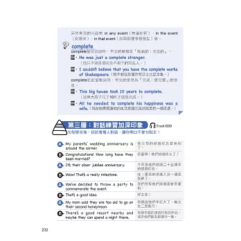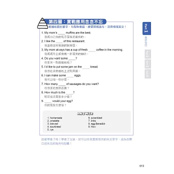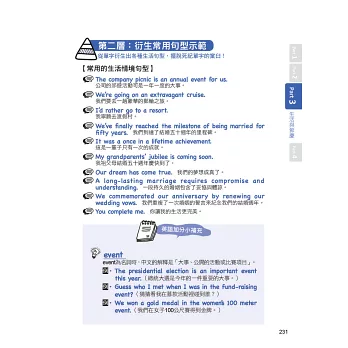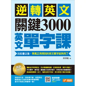 金字塔學習法顧名思義就是像金字塔一樣,一層一層堆疊起來,先從讀過+聽過單字(不必熟記),打好基底,然後透過各種實戰應用,漸漸蓋出完整架構,最後以練習與挑戰的方式一次攻頂,如此一來你的英文單字力就會達到不可思議的進步幅度,而且想忘都忘不掉!本書特別從「老外最常使用的單字」與「我們平時最頻繁接觸的情境」當中,嚴選出3000個最適合拿來打好金字塔基底的單字,並且搭配線上隨掃隨聽的MP3錄音,就是要讓你在出社會以後,還能上一堂真正時用的英文單字課!