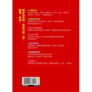 答案就在王麗蘭老師新編的馬來語教材《信不信由你,一週開口說馬來語!》裡。學習一個新的語言要從日常生活開始,因為語言是為了人與人之間「溝通」、「交流」使用的,畢竟在日常生活中,我想我們不會使用一些「生硬」的用語或「文縐縐」的句子吧!而這本教材的編寫完全以大家的「日常生活」出發,內容淺而易懂。本教材在錄音階段時,負責的錄音師在短短3小時的過程中就能將馬來語朗朗上口,可說是「即學即用,簡單又容易」的最好證明。