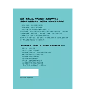 志恆老師告訴過我,每個人天生就有充分的能力活出自己想要的樣子,這是我們的權利也是責任。這本書不但給我們觀念,也有實際的步驟與做法,在走上自己道路的同時,妥善處理家人的過度關心或過度擔憂,也很重要。我和志恆老師一樣,離開預期的人生軌道、踏上自由工作之路,書中許多情境讓我反思自己的經驗,如果能早點具備這些心理建設,不知道有多好!──自由作家 劉揚銘
