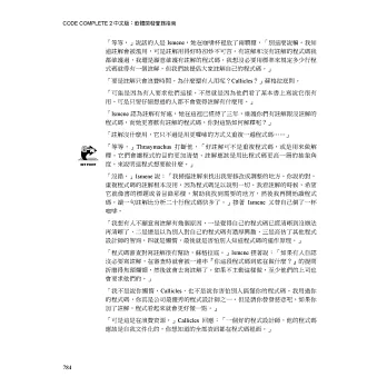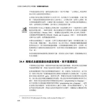 「我不遺餘力地為Steve McConnell 的《Code Complete》拍手叫好……這本書取代了 API 參考手冊,成為陪我工作的親密夥伴。」——Jim Kyle,《Windows Tech Journal》