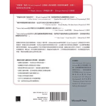 「Microsoft Press 出版了我認為是軟體建構方面很好的書,每位軟體開發人員的書架上都該有這本書。」——Warren Keuffel,《Software Development》